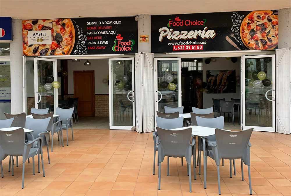Food Choice Pizza restaurant in Albir. Situated at the top of Boulevard de los Musicos on the roundabout by Lidl supermarket.